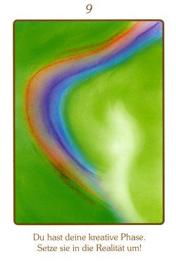 Bunt wie das Leben ist diese Karte. Grün ist eine Farbe des Herzens, des Neuanfangs, des Raumes. Türkis ist die Farbe der Kreativität. Blau steht für Ruhe, Frieden, Vertrauen; Violett für die Heilung und die Integration von Extremen. Rot zeigt uns Kraft, Stärke und Ausdauer, Orange Lebensfreude und Weiß steht für die Entscheidung aus der Fülle.